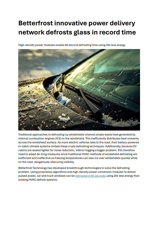 Traditional approaches to defrosting icy windshields channel ample waste heat generated by internal combustion engines (ICE) to the windshield. This inefficiently distributes heat unevenly across the windshield surface. As more electric vehicles take to the road, their battery-powered in-cabin climate systems imitate these crude defrosting techniques. Additionally, because EV cabins are sealed tighter for noise reduction, interior fogging a bigger problem. EVs therefore need to adapt de-icing measures since traditional HVAC methods of windshield defrosting are inefficient and ineffective as freezing temperatures can also ice over windshields quickly while on the road, dangerously obscuring visibility
