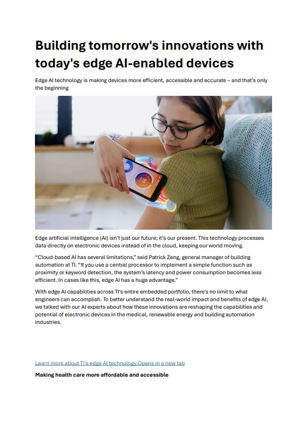 “Cloud-based AI has several limitations,” said Patrick Zeng, general manager of building automation at TI. “If you use a central processor to implement a simple function such as proximity or keyword detection, the system’s latency and power consumption becomes less efficient. In cases like this, edge AI has a huge advantage.”