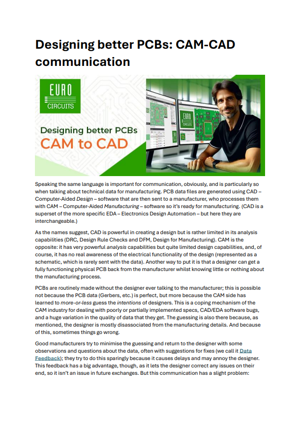 Speaking the same language is important for communication, obviously, and is particularly so when talking about technical data for manufacturing. PCB data files are generated using CAD – Computer-Aided Design – software that are then sent to a manufacturer, who processes them with CAM – Computer-Aided Manufacturing – software so it’s ready for manufacturing. (CAD is a superset of the more specific EDA – Electronics Design Automation – but here they are interchangeable.)