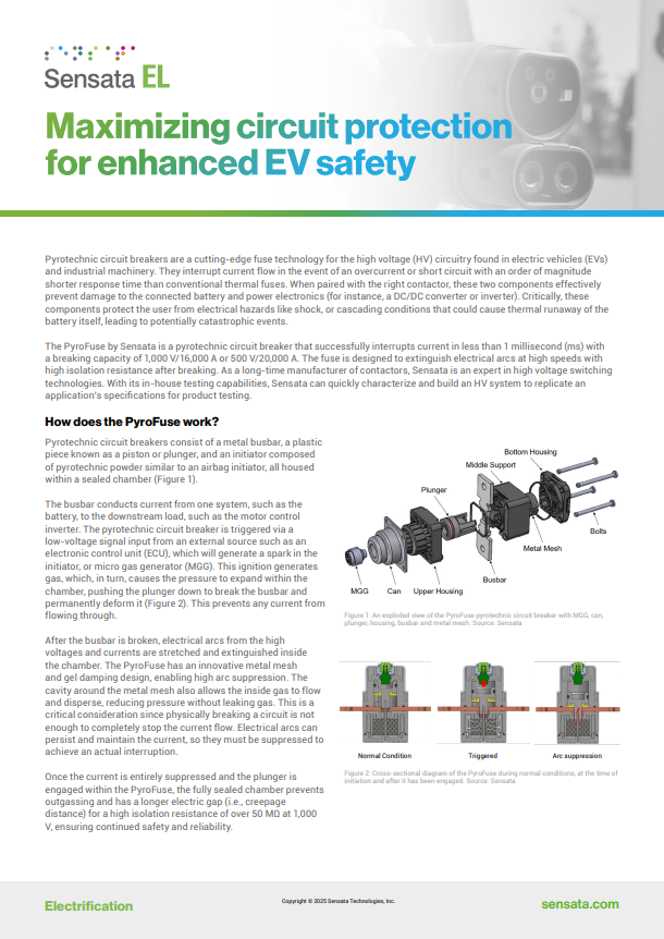 Pyrotechnic circuit breakers are a cutting-edge fuse technology for the high voltage (HV) circuitry found in electric vehicles (EVs) and industrial machinery. They interrupt current flow in the event of an overcurrent or short circuit with an order of magnitude shorter response time than conventional thermal fuses. When paired with the right contactor, these two components effectively prevent damage to the connected battery and power electronics (for instance, a DC/DC converter or inverter). Critically, these components protect the user from electrical hazards like shock, or cascading conditions that could cause thermal runaway of the battery itself, leading to potentially catastrophic events.