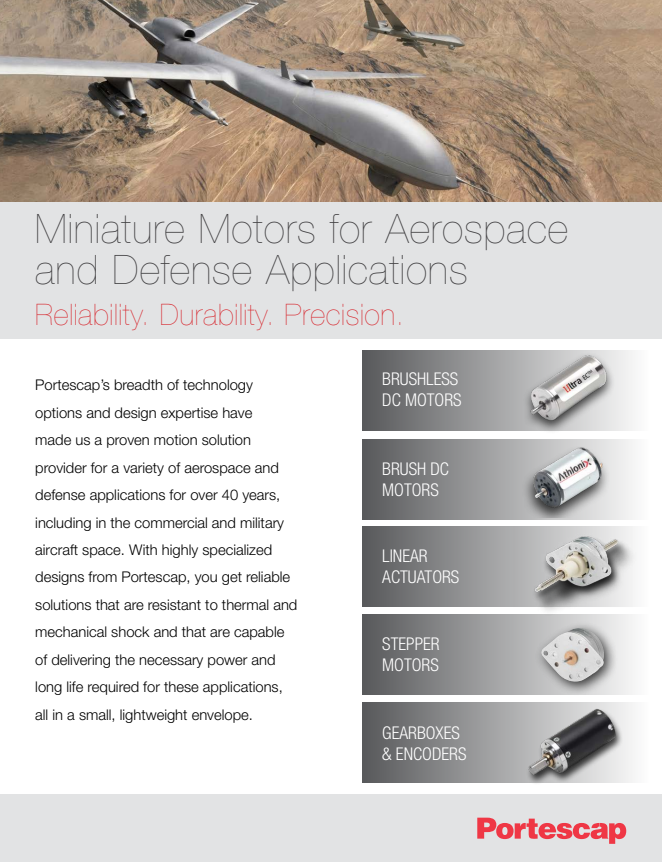 Portescap’s breadth of technology options and design expertise have made us a proven motion solution provider for a variety of aerospace and defense applications for over 40 years, including in the commercial and military aircraft space. With highly specialized designs from Portescap, you get reliable solutions that are resistant to thermal and mechanical shock and that are capable of delivering the necessary power and long life required for these applications, all in a small, lightweight envelope.