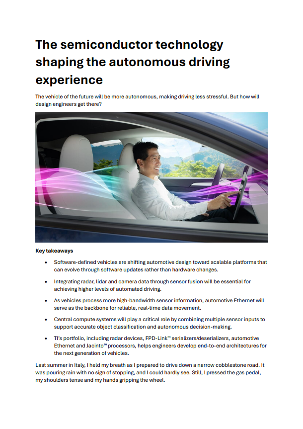 The report explores how semiconductor advancements are driving the evolution toward software-defined vehicles (SDVs) and higher levels of autonomy. It highlights the critical roles of sensor fusion—integrating data from radar, lidar, and cameras—and the implementation of automotive Ethernet as a high-speed “digital backbone” for real-time data movement. By centralizing software and utilizing powerful processors for object classification and decision-making, these technologies aim to transform the driving experience from a stressful task into a safe, autonomous journey.